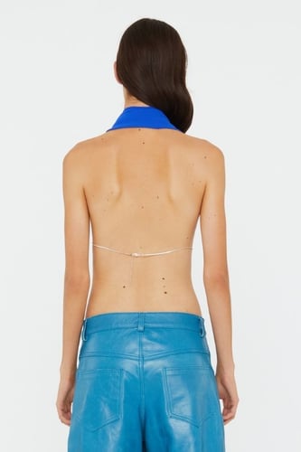 Crafted in washed silk georgette with a crepe-like finish, the Silk Scarf Chain Bra Top wraps the body in a fluid, scarf-like gesture. A font drape falls from a gathered neckline, while a fine metal chain secures the open back - balancing softness with subtle structure. Style with leather trousers or tailored separates for an elevated approach to after-dark dressing.
